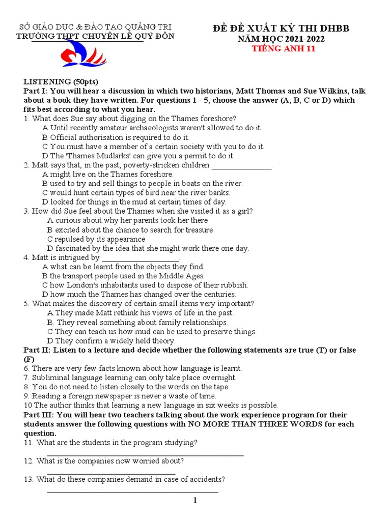 Proposal for the 20212022 Grade 11 English Exam at Le Quy Don Specialized High School PDF